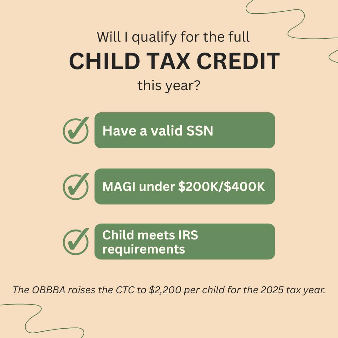 - Because of the OBBBA, you (or at least one spouse if filing jointly) must have a valid SSN to claim the CTC.